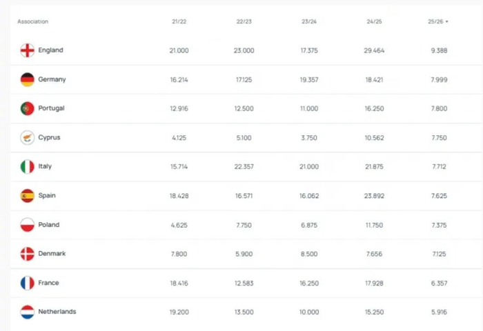 英格兰9.388领跑欧战积分,英超比欧冠稳定得多?